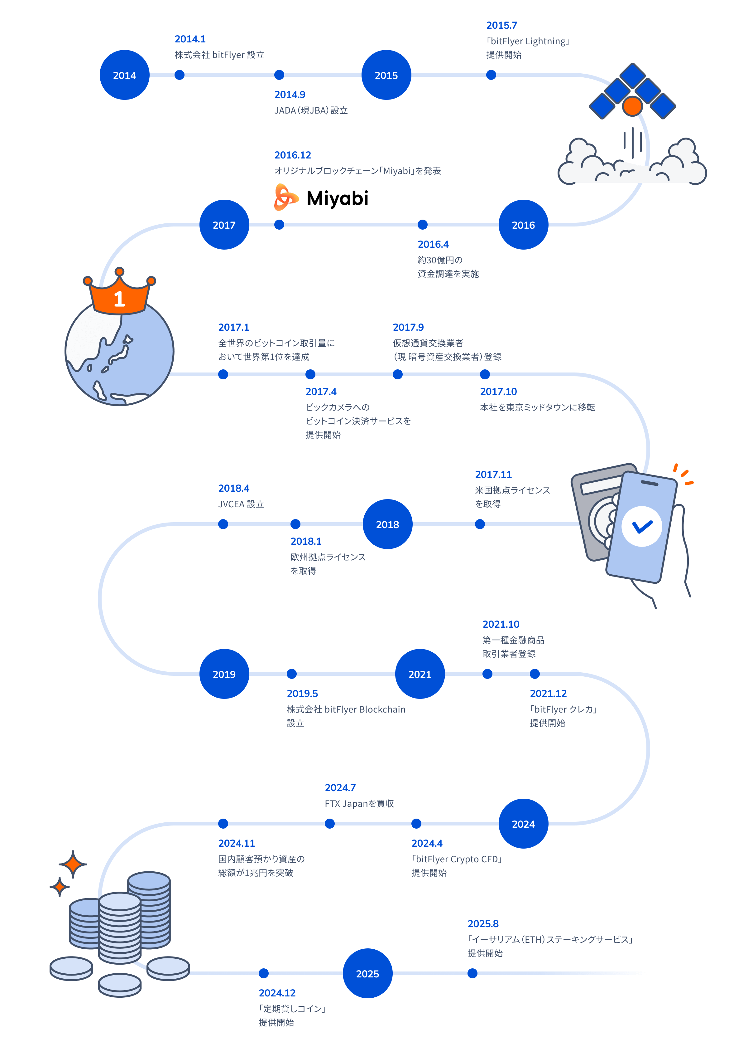 bitFlyer は 2014 年の創業以来、「ブロックチェーンで世界を簡単に。」というミッションのもと、暗号資産とブロックチェーンの可能性を信じ、その社会実装に挑戦してきました。創業当時、日本でビットコインを知る人はごくわずかで、安心して取引できる環境も整っていない中、私たちは法整備への提言や自主規制ルールの策定、そしてセキュリティの徹底を通じて、業界全体の信頼性向上に努めてきました。